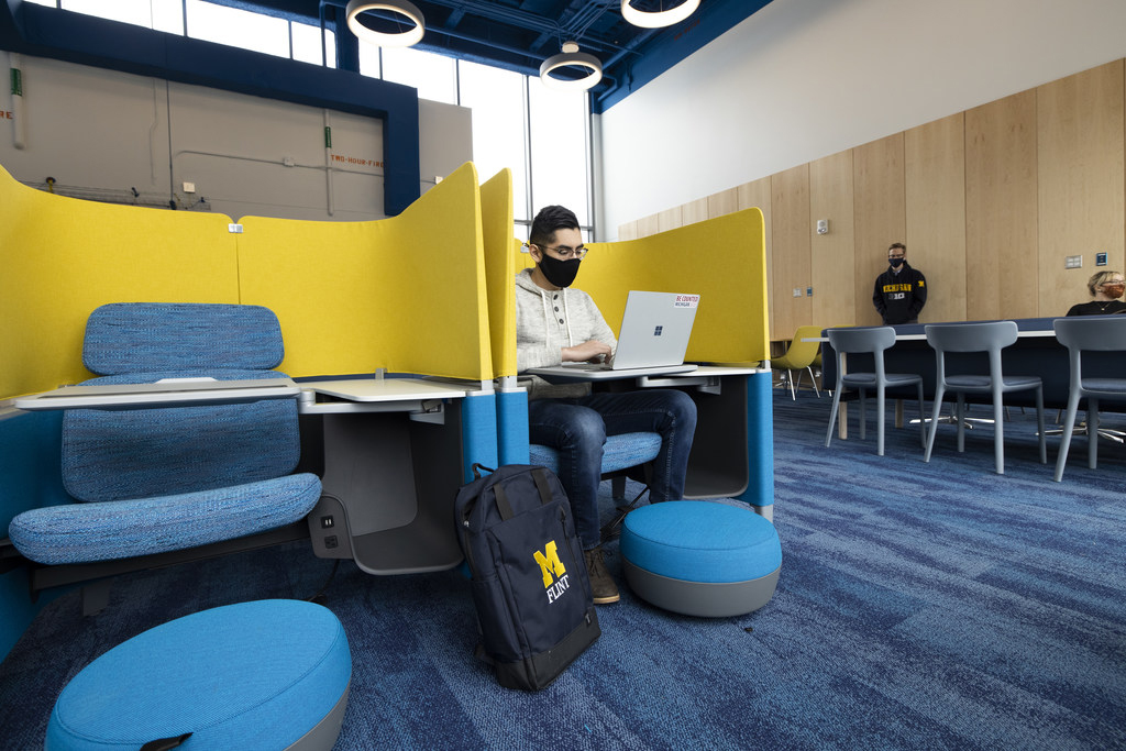 “It’s stunning,” said University of Michigan-Flint student, Manny Wright. “I’m setting up shop here. I told all my friends that from now on, if they need me, I’ll be hanging out here.” Wright was sitting in one of the student meeting areas in UM-Flint’s newly-opened Murchie Science Building Expansion. It was his first time there and he was obviously impressed. “Just walking through and looking at all of the community rooms is exciting,” he adds. “I board at Riverfront and it offers some of the same, but this is different. I’m claiming this spot.”