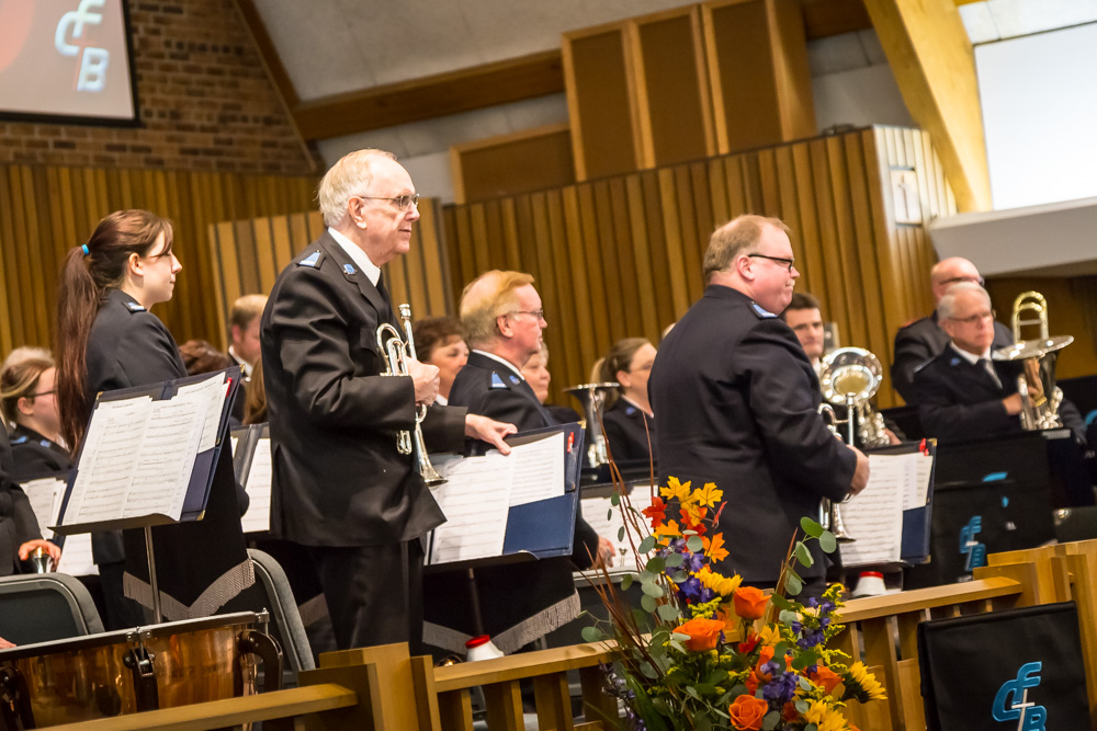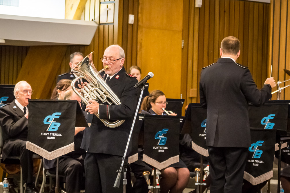 The Flint Citadel Band of The Salvation Army played to a packed house for their 85th Annual Thanksgiving Concert on November 17. Special Guest, Bandmaster William Himes, showcased not only his musical talents as a euphonium soloist, but also his ability to bring the Gospel alive through musical scoring. The Flint Citadel Band performs this holiday classic concert every year on the Friday before Thanksgiving. This year, the performance featured 11 songs, including several by Bandmaster Himes, (“Come, Ye Thankful People,” “Jehovah Roi” and “Pathway of Hope”), as well as a euphonium quartet playing, “I’ll Not Turn Back.” Following the concert, the Flint Citadel Band League sponsored a meal catered by Roma’s Restaurant that was enjoyed by the musicians and Band League Support members.