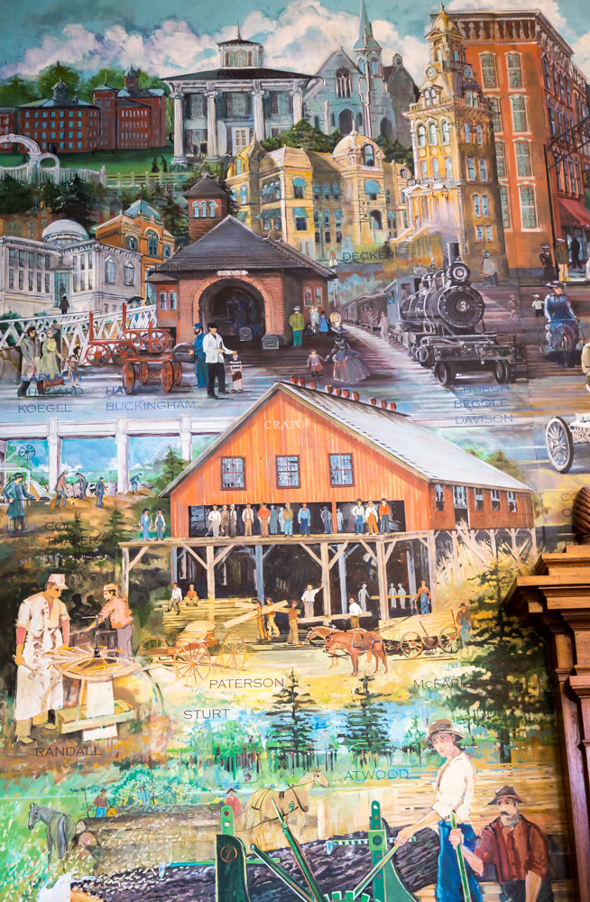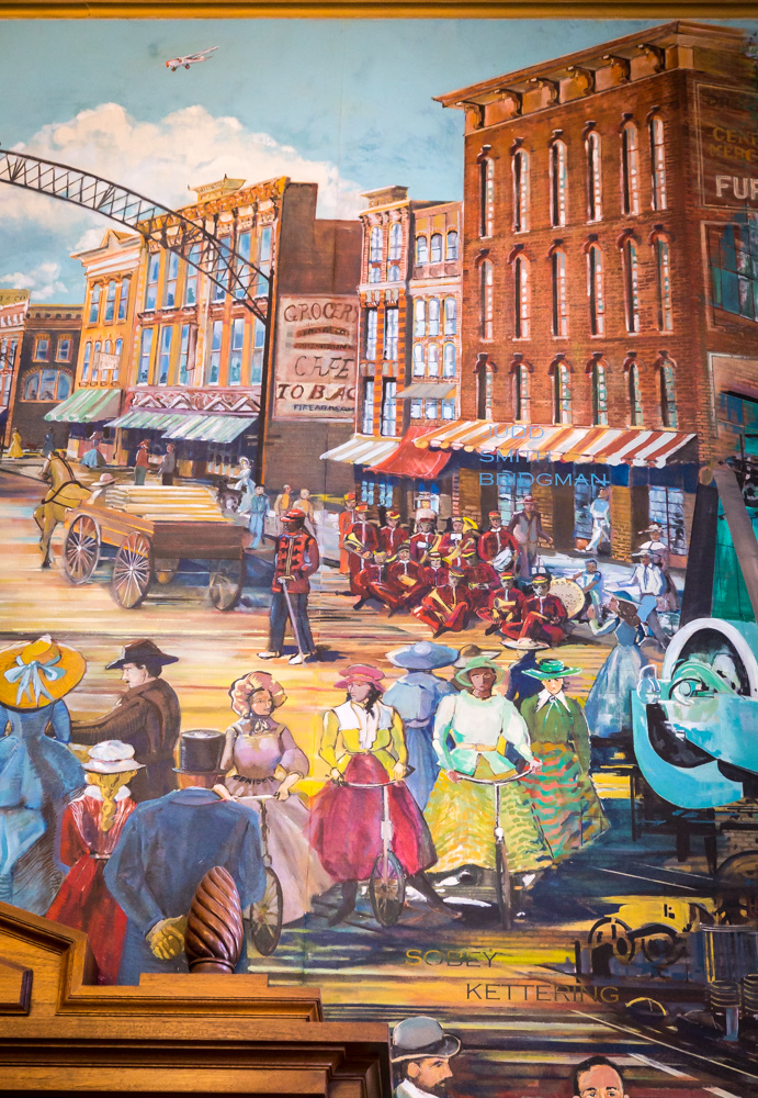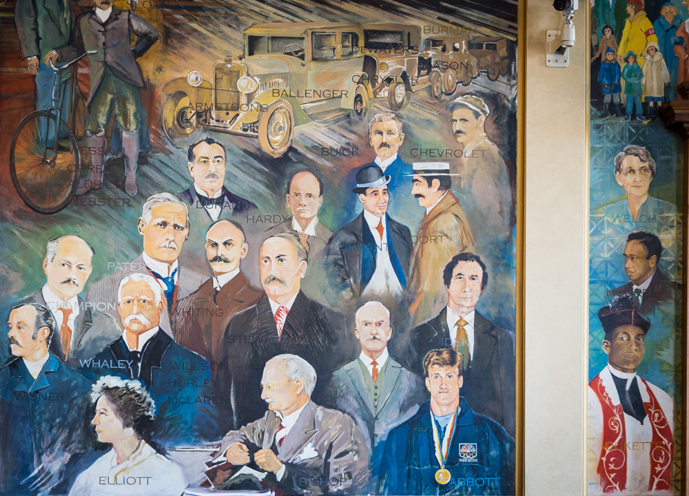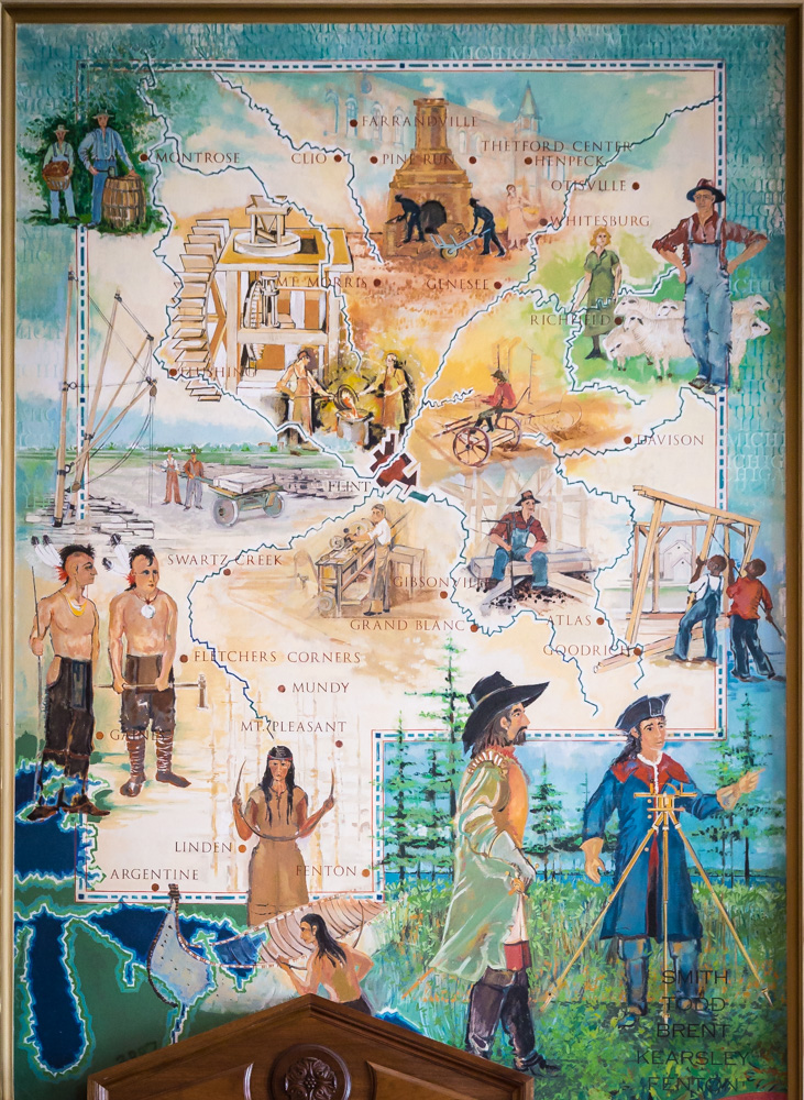 In Judge Duncan Beagle’s fifth-floor courtroom, on the non-historic side, the courthouse’s newest mural is displayed. With private funding from the Genesee County Bar Association, Genesee County Bar Foundation, the legal community and other benefactors, a mural was conceived that depicts the development of Genesee County through its small cities and townships. The mural was also created by Stefan Davidek and many talented members of his family, and depicts local leaders from various walks of life. It was formally dedicated on September 28, 2007.