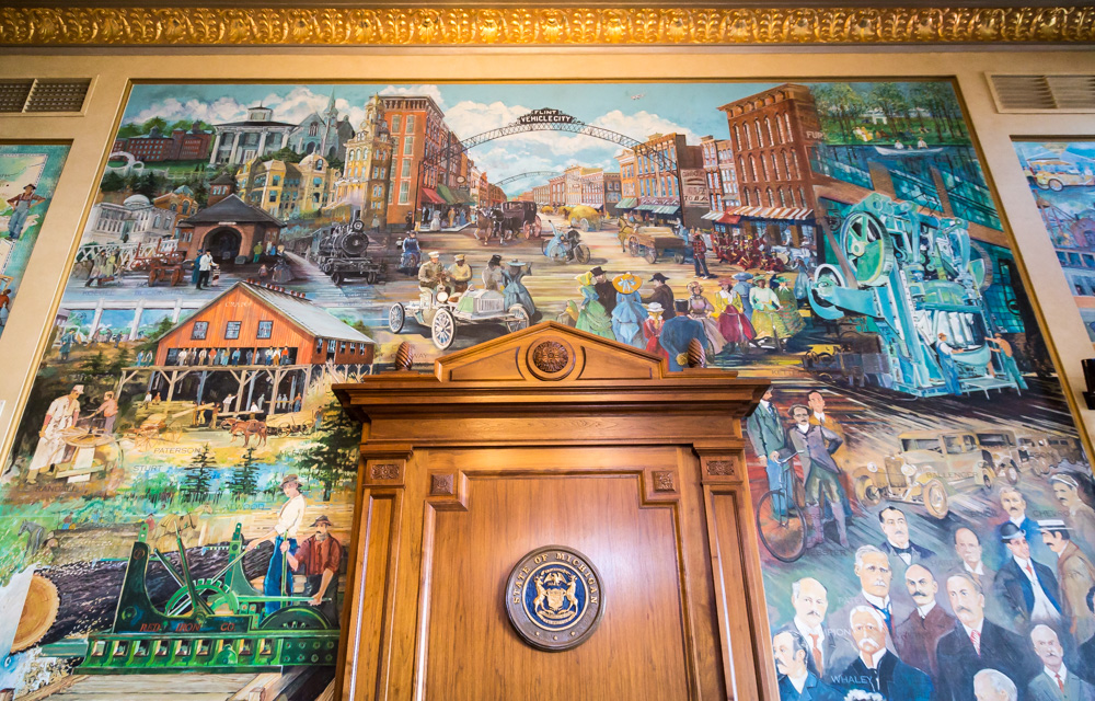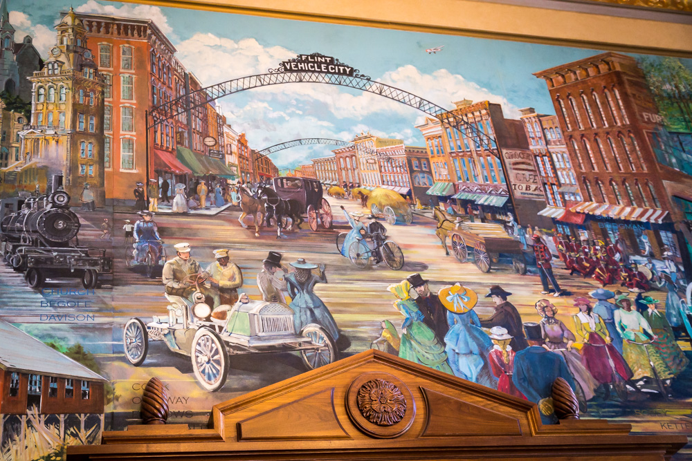 According to Menear, there were three murals on the historic side of the Courthouse, which were the showpieces when it opened in 1926. “One mural had been taken down and destroyed,” Menear explains. It was re-created by the late Flint-born artist, Stefan Davidek (1924-2016), and is now displayed in Judge Archie Hayman’s courtroom. A 1926 black-and-white photo and remaining mural pieces located above the ceiling line provided the basis for the re-creation. The mural panels represent the industries that provided economic growth in the region: lumber, agriculture and manufacturing. Though painted in 1926, the mural was reminiscent of the monumental artistic works commissioned in The Great Depression, under President Franklin D. Roosevelt’s Works Progress Administration.