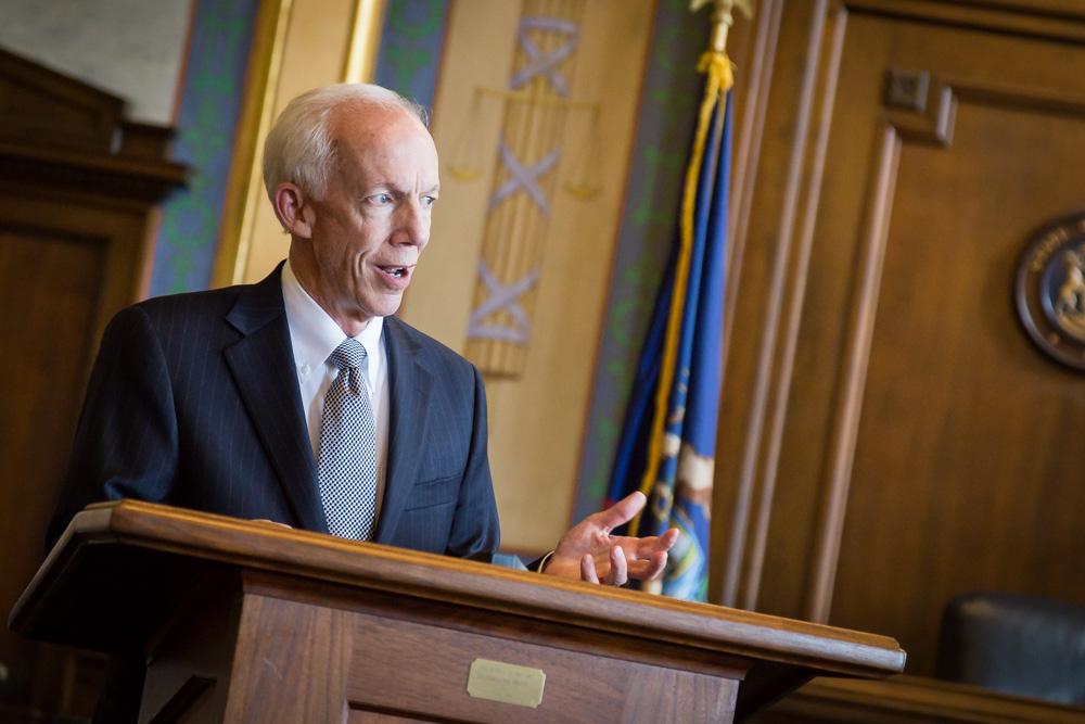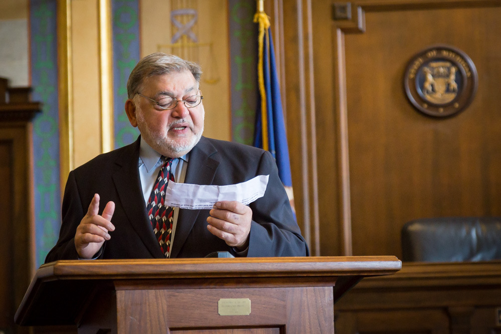 Chief Judge Richard Yuille was the first to speak at the ceremony. “It is my privilege to honor Andrew Jackson Transue,” Yuille said. “He was a very fine lawyer.” Don Rockwell President-elect of the State Bar of Michigan, gave a little history about Transue’s background. He was born in Clarksville, Michigan and graduated from the Detroit College of Law, was admitted to the bar in 1926 and began practicing law in Flint in 1927. He was also a Genesee County prosecuting attorney for two years and was elected to the U.S. Congress, where he served for three years. After that, he resumed his practice in Flint until he passed away. “Andy commanded great respect,” Rockwell noted. But what he remembers most about Transue is the 1952 trial.