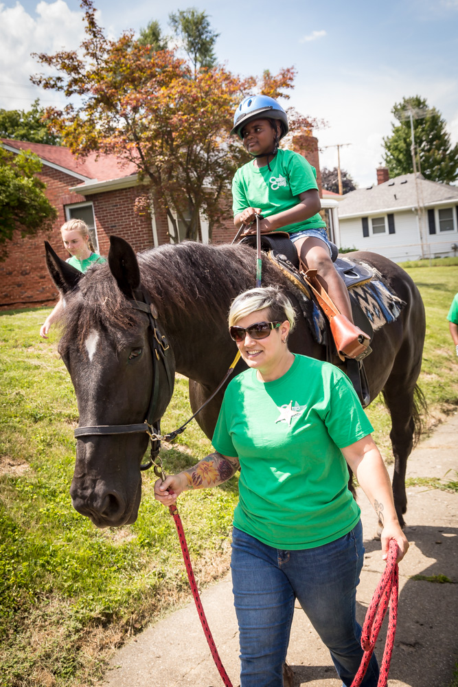 Each summer, Camp Casey provides 40 Horsey House Calls (HHC) – a program that evolved from the first Camp Casey. Rather than kids and their families traveling to the farm, the horse comes to them! Oftentimes, Camp Casey works with the parents to make it a complete surprise when a child opens their door and is greeted by their own HHC Party, complete with T-shirts, crafts and food for their friends and family.