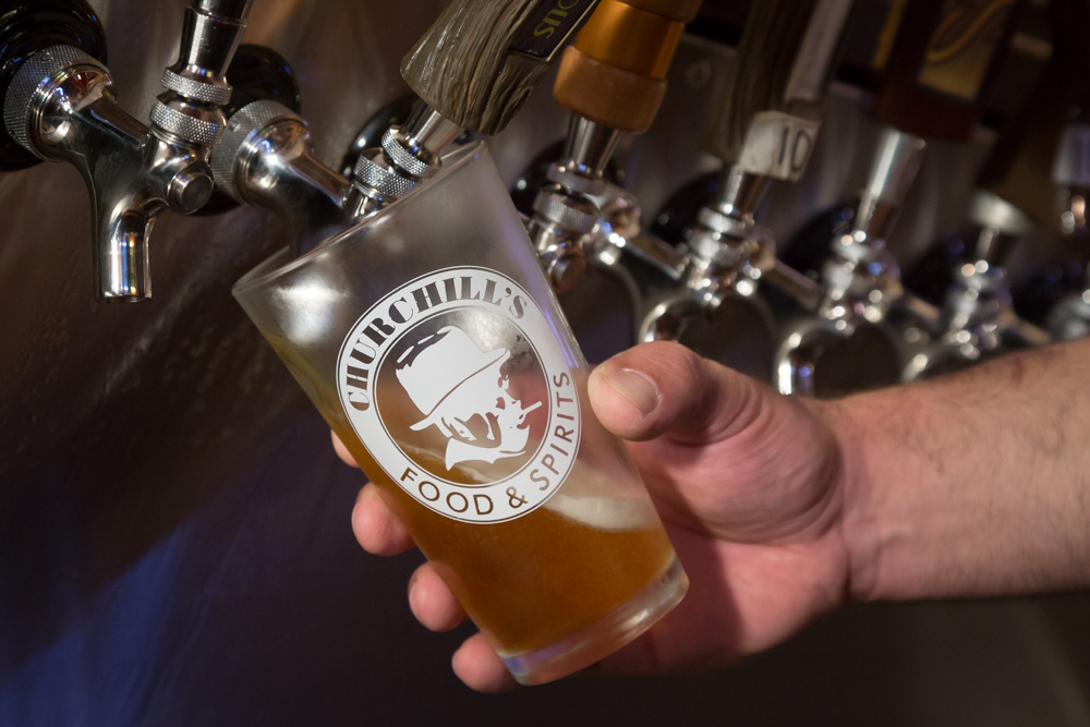 In case you’re wondering, this whiskey bar also serves up some really good food! Johnny describes it as a “bar menu with a bit of a twist.” Bill is in charge of the food and has introduced Churchill’s patrons to new sandwiches and fresher fare. All of the bread is purchased fresh from Aldo’s Bakery in Grand Blanc. The Twisted Chicken is a big hit – a grilled chicken breast, bacon, ham, Swiss cheese, lettuce, tomato and mayo on a pretzel bun, served with house-made chips and a pickle. The burgers are made with fresh, never frozen, ground beef. “The salads are very popular, especially at this time of year,” says Johnny. They include Chicken Caesar, Taco, Buffalo Chicken and Chef Salads, to name a few, all made from fresh-cut veggies and served with breadsticks. Some of the favorite appetizers are the Fried Pickles and the English Fries. “We use fresh pickles, not jarred,” says Johnny. “Our fried pickles are really good.” The English Fries are freshly sliced potatoes that can be topped with bacon, onion and cheese.
