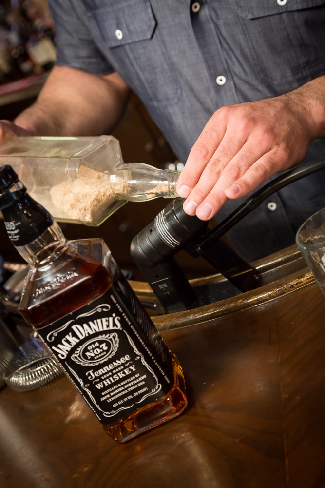 Churchill’s Co-owner Johnny saites won the 2016 City’s Choice Award for Favorite Bartender. Above, he creates a Jasper Smoke – Jack Daniels whiskey infused with hickory smoke and served over hand-cut ice.