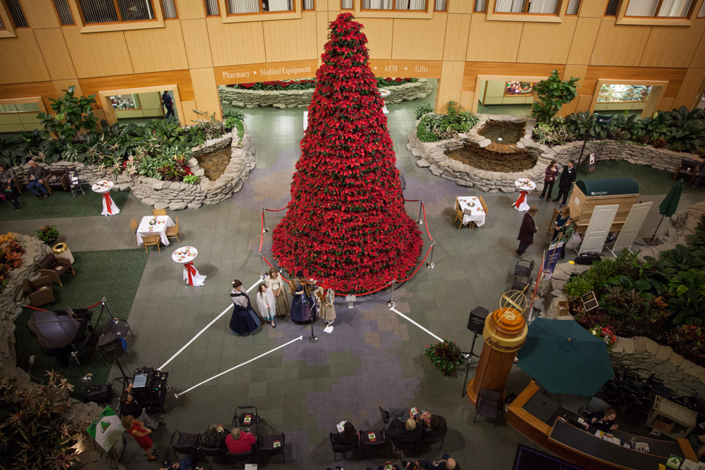 The Tree of Love is a 25-foot-tall tree created from 700 poinsettia plants, which has graced the hospital atrium beginning Thanksgiving weekend and will stand through the holidays.