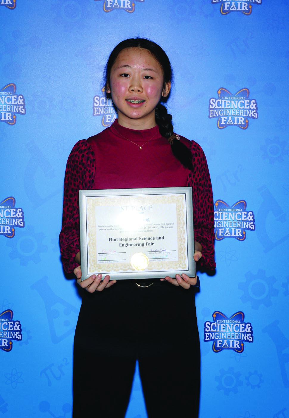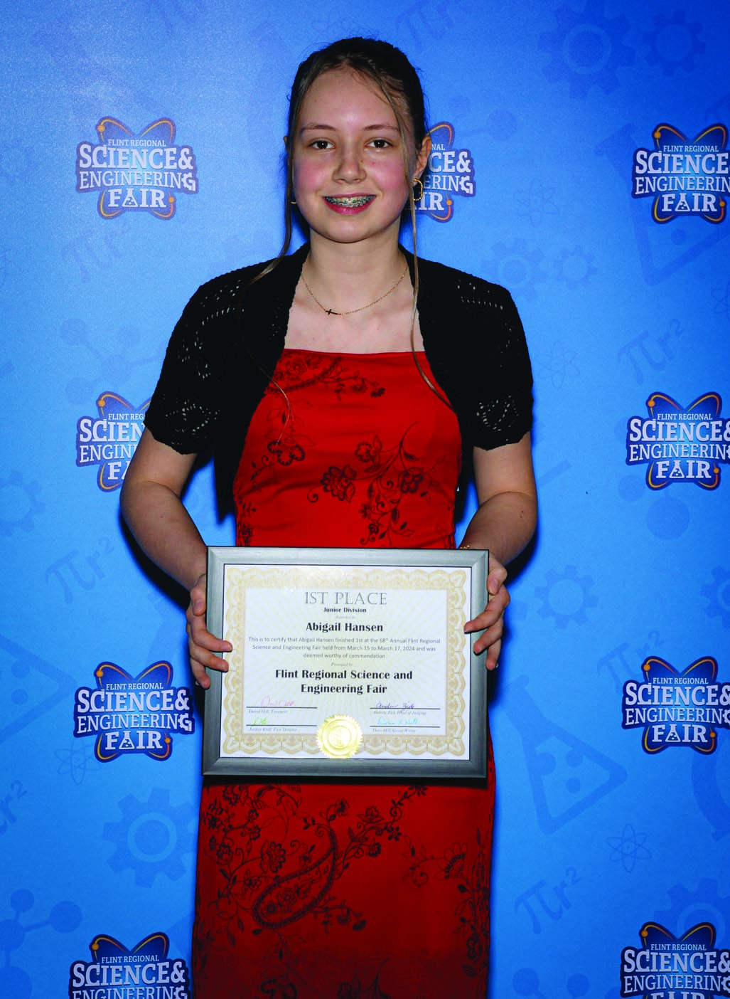 Students won over $10,000 dollars in cash prizes plus scholarships to Kettering University and UM-Flint (three, four-year full-tuition scholarships)! The top prize in the Senior category was $500 plus an all-expense-paid trip to the International Science & Engineering Fair in Los Angeles in May. The prize was re-named this year in honor of David C. Hill, a longtime FRSEF supporter who competed at the first FRSEF in 1957 as a 7th-grader, winning the top prize in 1960 and 1962.