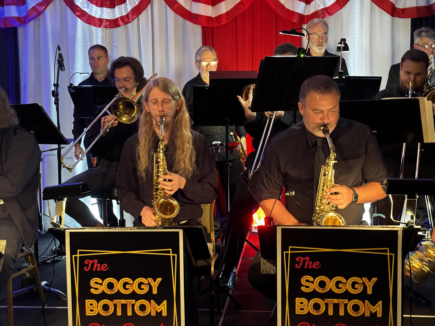 The patriotic atmosphere was elevated by Americana-themed food stations, red-white-and-blue décor, and the toe-tapping swing sounds of the Soggy Bottom Big Band, featuring two phenomenal vocalists — one being Ian Shetron, whose crooner style channeled Frank Sinatra with remarkable ease.