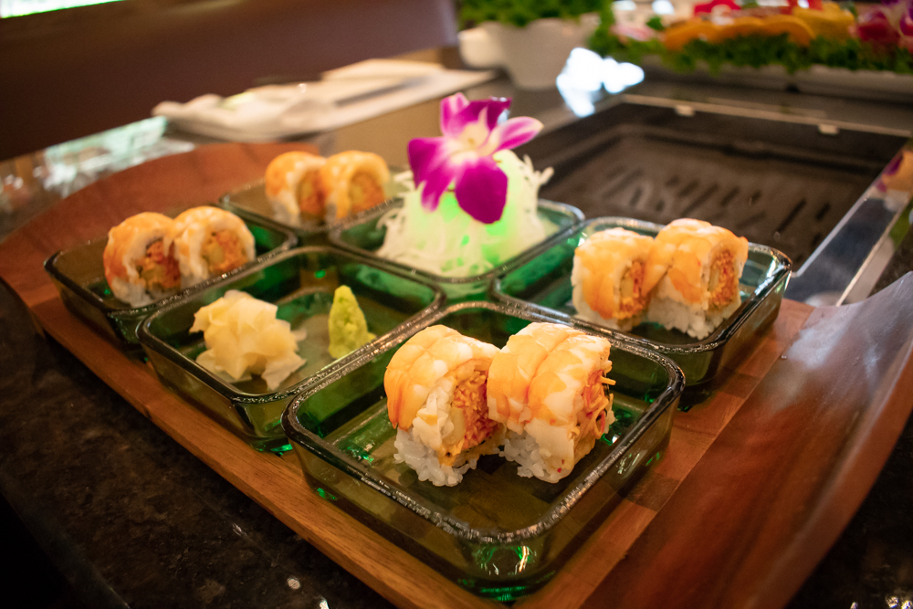 The menu at Goki Goki (Korean for “meat”) is extensive. According to Joe, the top sellers are the meat combo platters and sushi. The combos are made with premium, organic meats. “Each piece is hand chosen,” Jenna reports, adding that the vegetables come from their own organic garden behind the restaurant and from local farms. The beef combo includes rib eye steak, beef rib, beef brisket, and marinated galbi (Korean for “rib”) with assorted veggies. The combos are served with rice, onion salad, a choice of soup or salad, and bonchon – a variety of sauces and condiments that includes kimchee and marinated vegetables.