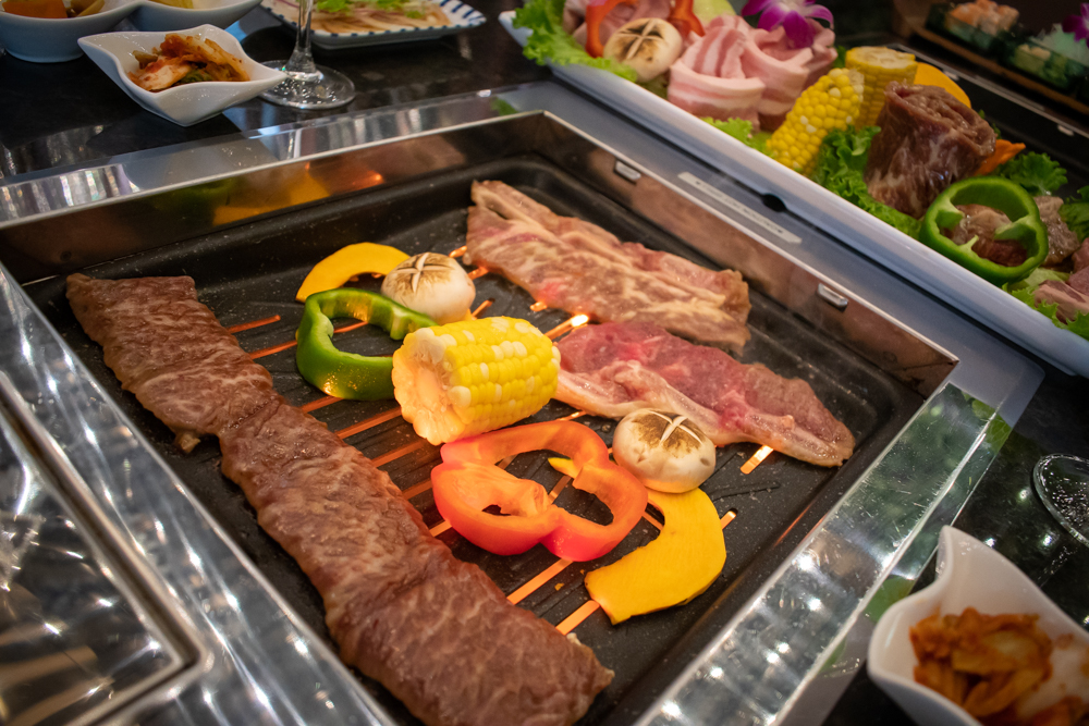 Also on the menu is a variety of soups, stews, and entrées such as Fried Seafood Udon Noodles (shrimp, calamari, mussels and oysters served with a special house sauce over thick noodles), and Goki Goki Dolsot, a dish made of rice cooked in a stone bowl (dolsot), topped with meat, vegetables and egg. The bottom of the bowl is coated with sesame oil, which cooks the layer of rice to a crisp, golden brown. The Korean BBQ dishes include a variety of meats: rib eye steak, beef rib steak, beef brisket, marinated beef ribs, Korean style ribs, pork belly and pork jowls, to name a few.