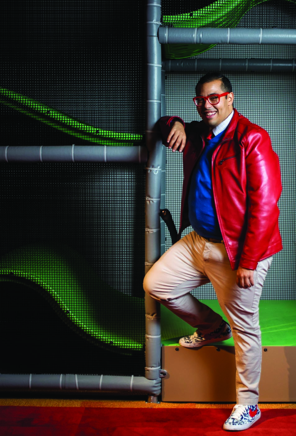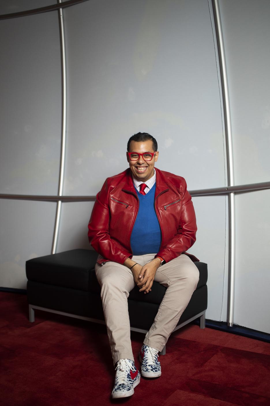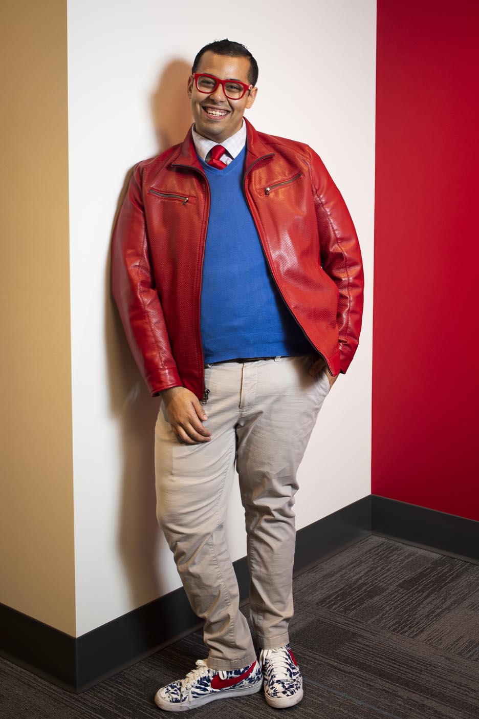 I tend to choose a more bold and colorful palette. I really enjoy challenging the standards of professional attire, choosing leather jackets or bomber jackets with shirts and ties over a suit coat, or incorporating tennis shoes and other exciting footwear into outfits. What I am most known for is my selection of colored eyeglasses with matching watch bands and cell phone cases.