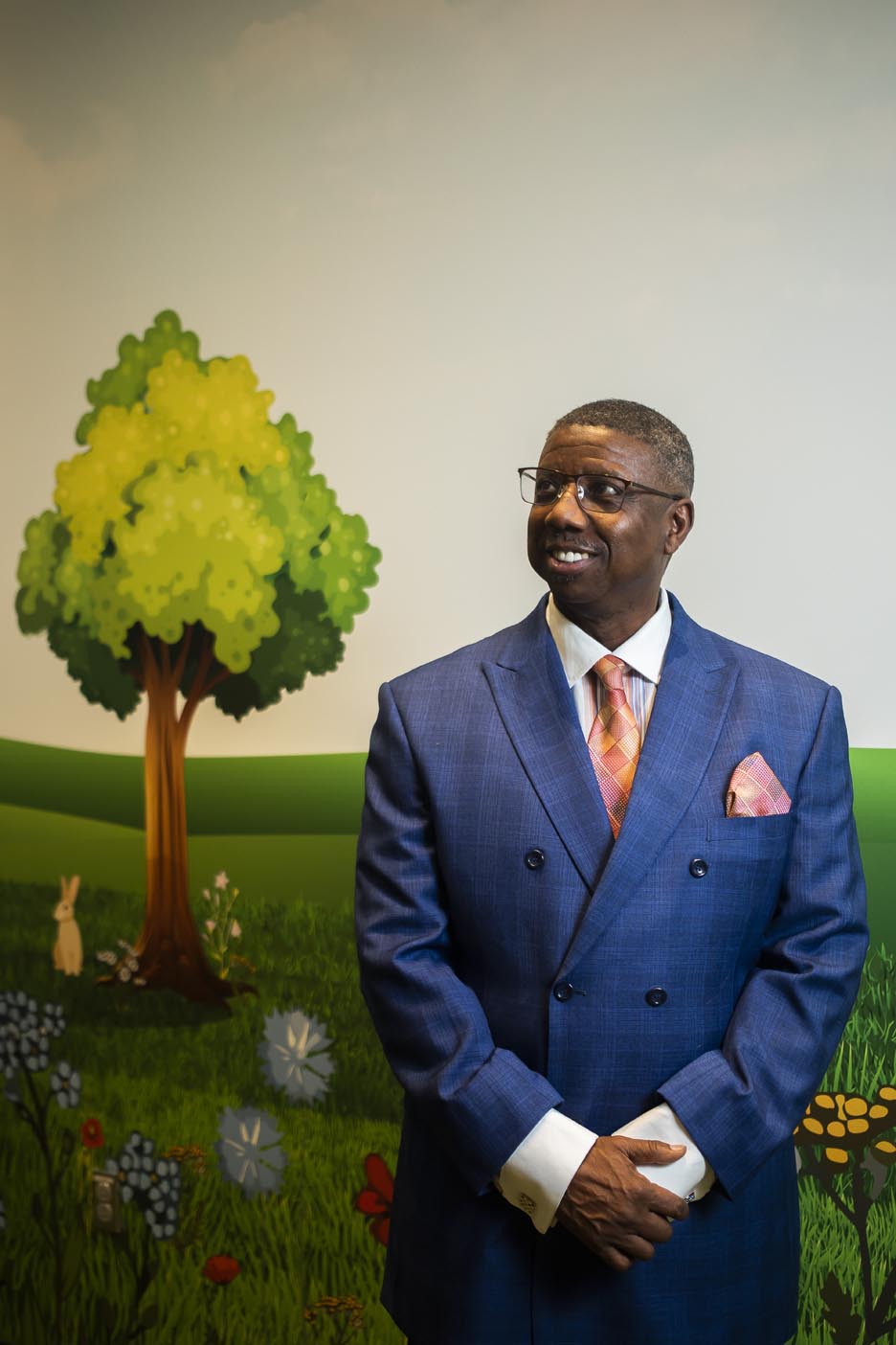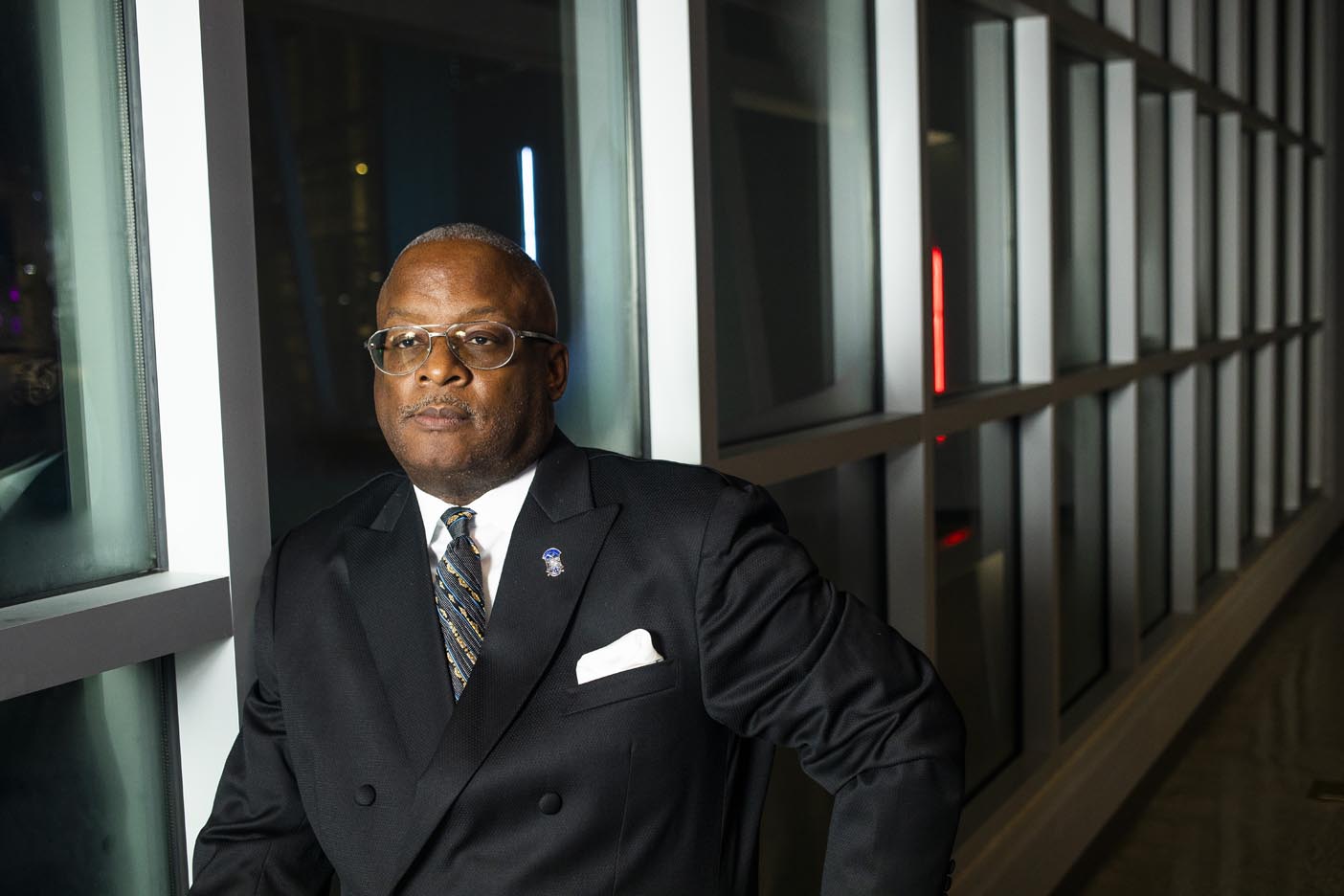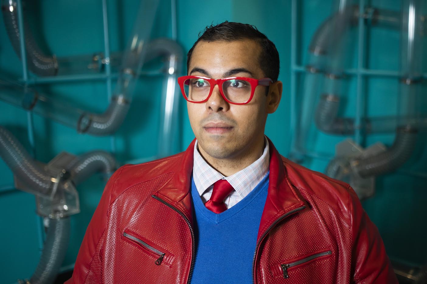 I tend to choose a more bold and colorful palette. I really enjoy challenging the standards of professional attire, choosing leather jackets or bomber jackets with shirts and ties over a suit coat, or incorporating tennis shoes and other exciting footwear into outfits. What I am most known for is my selection of colored eyeglasses with matching watch bands and cell phone cases.