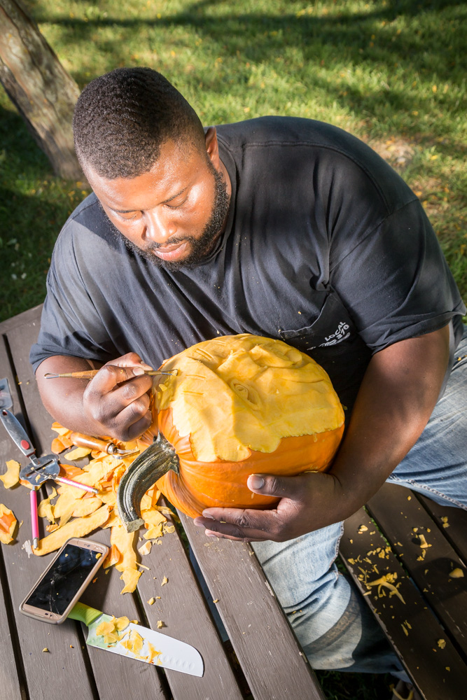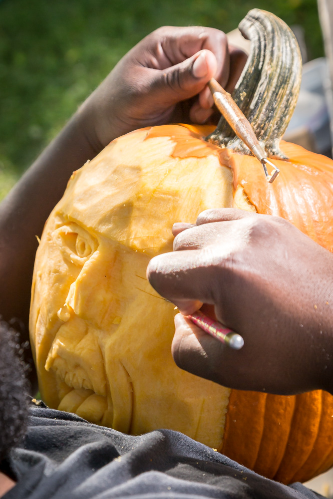 Marcus says he is basically self-taught, but picked up a few skills from the book, Thai Culinary Arts. He started carving pumpkins about four years ago, using what he learned from carving watermelons. “A pumpkin is a little thicker medium, but the same principles apply,” he says. He even does carvings in 3D, which can only be done on heavier pumpkins with thick skin. “It really pulls out the details,” Marcus says. He gains most of his work through “word of mouth” and has worked as far away as Saginaw and Detroit.