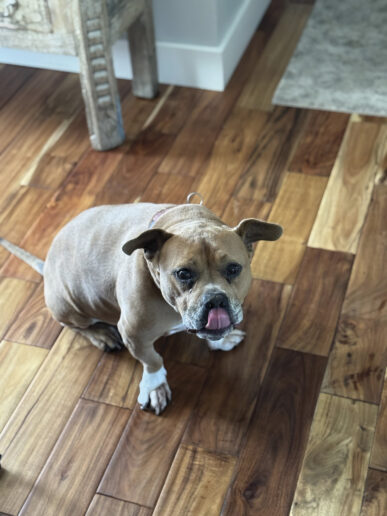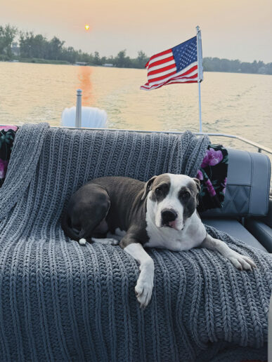 From the doggie shelter to the streets of Fenton, this mini pittie is the “Queen of the House.” Plum is the only sister to two human brothers. She was rescued from Flint Animal Control last November and has stolen the hearts of friends and family ever since. In her spare time, she enjoys naps—rotating through the beds and couches throughout the house, inevitably choosing to lounge outside in the sun. Her hobbies include walks through the woods, boat rides, and visiting her grandma.