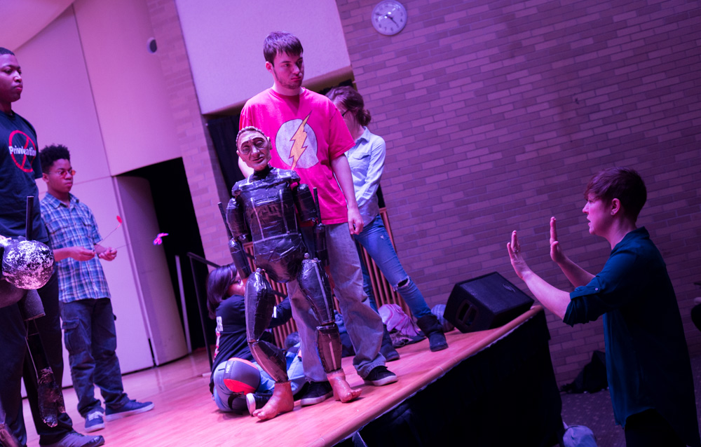 Something very exciting and unique is happening at Mott Middle College in Flint. Two passionate teachers had a simultaneous epiphany that led to the formation of a puppet-making class at the school, and the creation of Fly-Town Puppet Theatre. Mott Middle College is a non-traditional high school, operated by the Genesee Intermediate School District. It opened in 1991 on the campus of Mott Community College and specializes in overlapping an Associate’s Degree with a general education high school diploma.