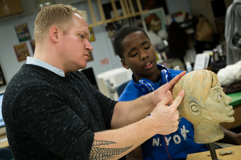 Gage Mardlin was working on making the body of the puppet. “I have a good knack for it,” he says. Ean Williams was sculpting a head, using “plastalena” – a clay material that doesn’t dry out. “You can be really creative,” he says. Another student was busy carving the puppet’s shoulder.