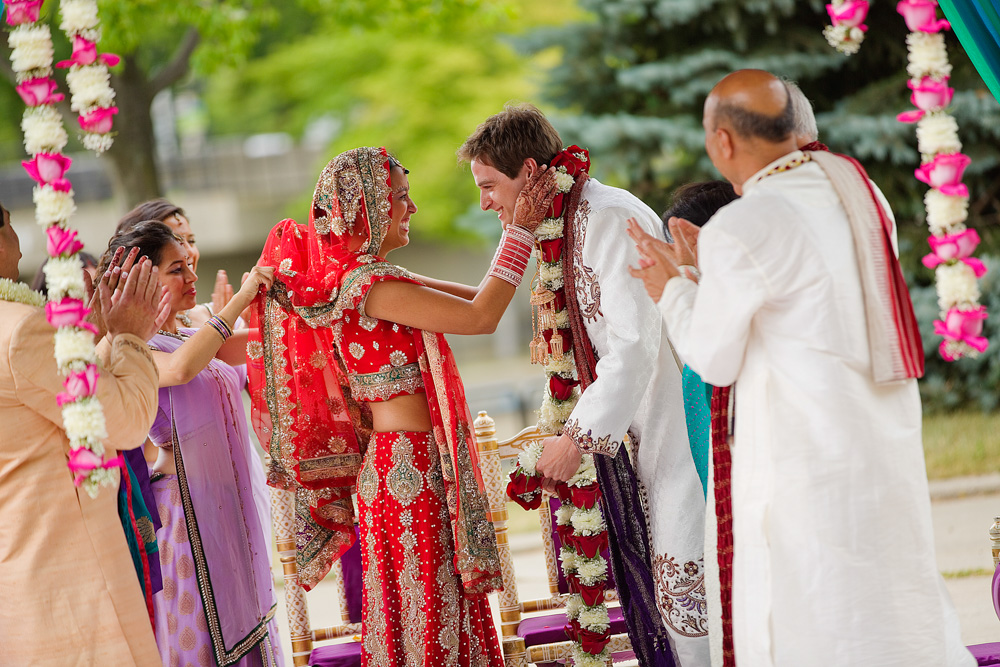 A Hindu wedding begins with the groom’s baraat procession – the arrival of the groom seated on a decorated horse, or in India, he often rides an elephant. “He gets on his horse and comes for his bride,” Sonali smiles. Accompanied by a procession of his bridal party and guests, Brent rode a white horse down the Saginaw Street sidewalk to the popular Riverfront Park, where the bride’s family welcomed him. The couple’s parents walked him to the mandap, a structure used in Hindu weddings, where all of the family members stand with the bride, groom, and wedding party. “It’s a family affair,” Sonali explains. “It was important to me to have the whole family involved.” The Hindu priest spoke in Hindi, but also translated the words to English.