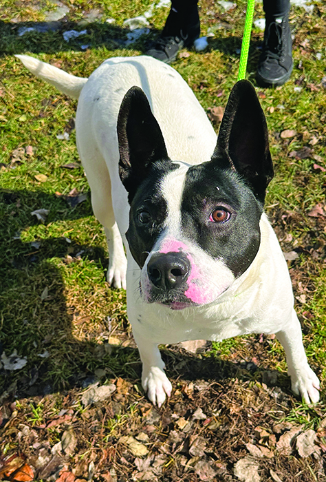 Guiness — Been at HSGC since December 26, 2024. Male, 3 years old, bull terrier mix. Needs a home with no other dogs, neutered, housetrained. Strong boy! Adoption fee is $125