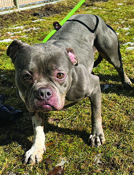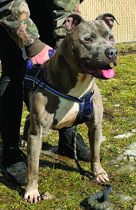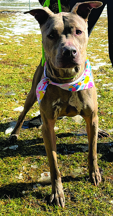 Phoebe — Been at HSGC since August 8, 2025. Female, approximately 2 years old, pit mix. Needs a home with no other dogs, spayed, partially housetrained. Shy, sweet girl who wants to cuddle. Adoption fee is $125