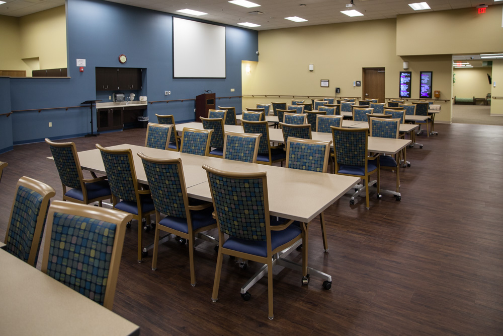 The building itself has large, open spaces in the main lobby and hallways, quiet rooms for naps or down-time, an outdoor gazebo, a cafeteria that also passes as an activity hall, with a projector screen for movies and Nintendo Wii video games, “to help with coordination,” says Dr. Ekhande. Of course, arts & crafts and board games are included as part of recreational therapy. Sivertson mentioned one participant was even asked to design the bingo cards for the activity hall.