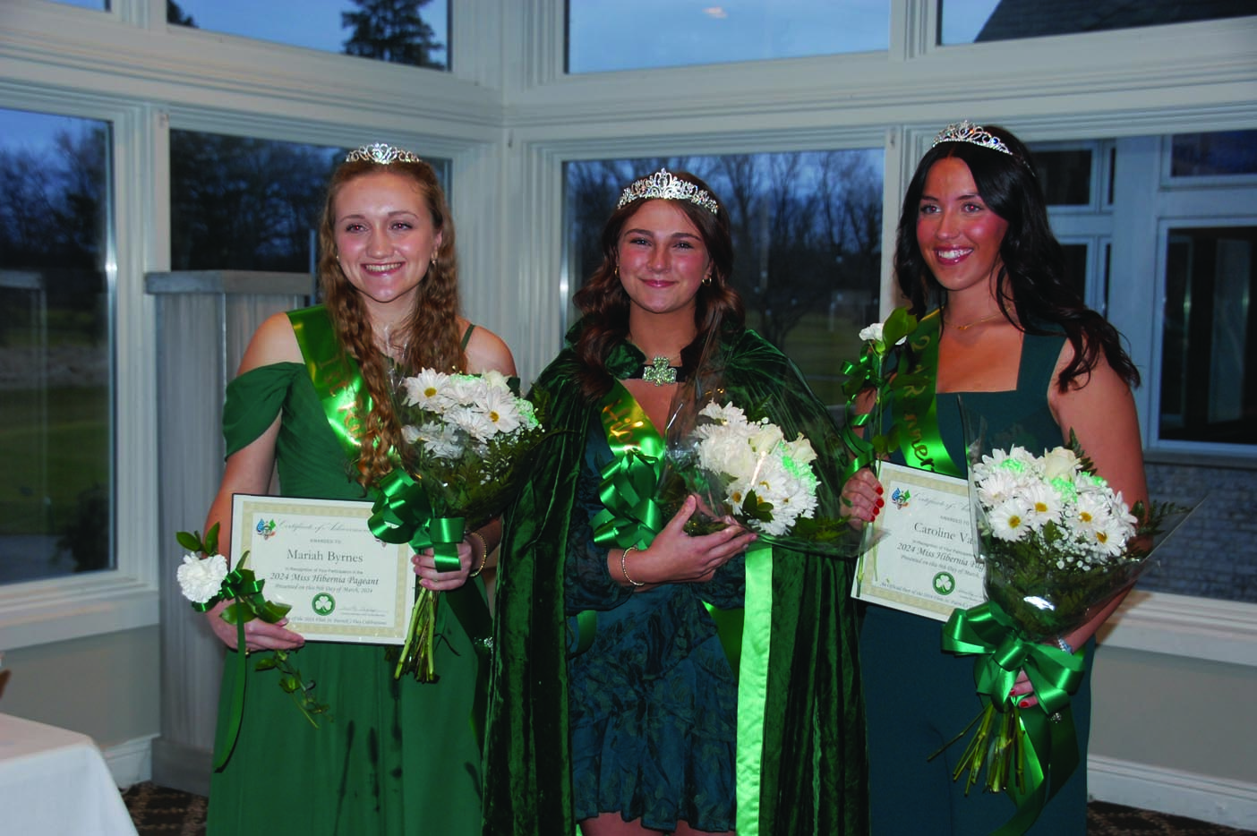 Festivities began with the Miss Hibernia Pageant and crowning of Meredith Knight of Flushing and her Court. The pageant invites young ladies to participate who are of Irish descent, a Genesee County resident or full-time student at a County high school or college. They completed an Official Biographical Form and were judged on their knowledge of Irish heritage, poise, personality, appearance and an interview with the Screening Committee: Theresa Hurley, Stacy McGraw and Loretta O’Reilly. Eight contestants from around Genesee County competed for more than $4,500 in scholarship awards. Ms. Knight received $2,000; first runner up Mariah Byrnes of Laingsburg received $1,500 and second runner up Caroline Vance of Flint, $1,000. The contestants were judged by Paul Cavanaugh, Gerri Lajewski and Lisa Marie Szukhent.