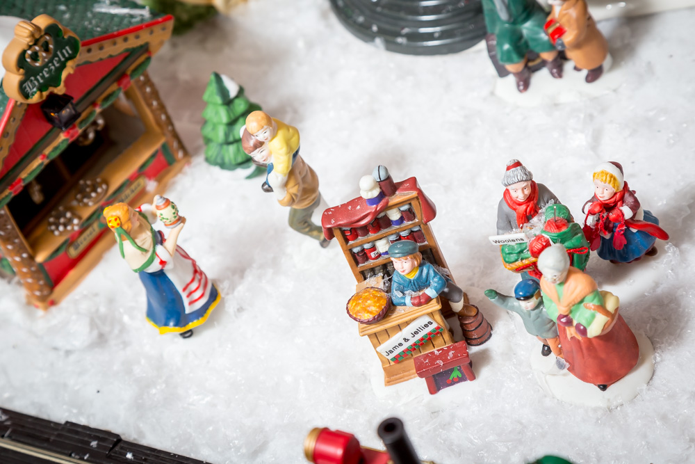 There are those who create miniature Christmas Villages … and then there are Lynn and Kathy Hopper, whose miniature Christmas Village has been in the Hopper family for over 100 years. Lynn’s grandmother started the collection with miniature ice skaters that were made in Germany. When the collection was passed on to Lynn’s mother, it consisted of six houses and a church. “We would go to toy stores to find little figurines to add to it,” Kathy recalls.